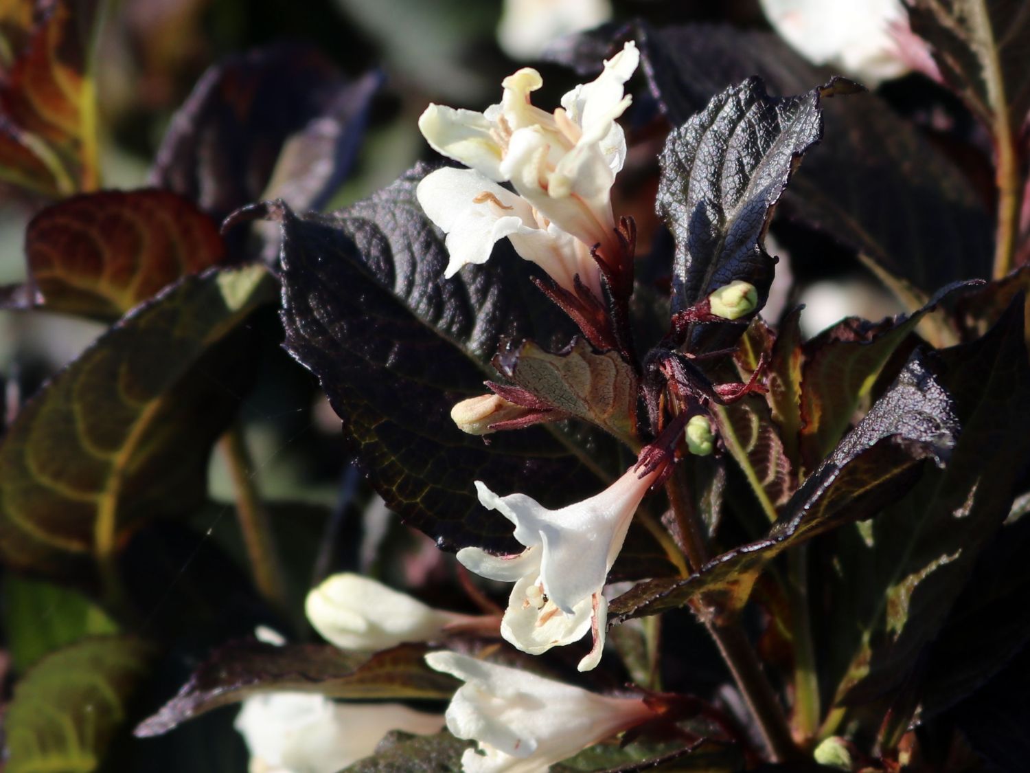 Schwarzblättrige weigelie ebony&ivony. Die weigela florida 'ebony and ivory' bietet einen außergewöhnlichen kontrast: Die trompetenförmigen, weißen blüten im gegensatz zum dunkelgrün, bis schwarzroten laub im. Cette variété de weigela à petit développement est tout en contraste avec ses feuilles vert pourpre sombre et ses fleurs blanches. Seine blätter sind länglich, zugespitzt mit gesägtem rand, haben einen schönen. Weigela florida ebony & ivory® ist ein sommergrüner, aufrechter, breiter und kompakter kleinstrauch, der herrliche dunkelpurpure, eiförmige blätter trägt.